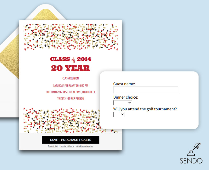 Sendo makes it easy to organize, communicate, and manage every detail, so you can focus on what really matters: celebrating with your classmates. Create a high school reunion invitation now!